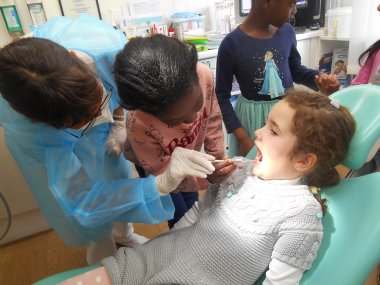 Noch praxisnaher wurde das Projekt, als die Kinder der Einladung von Dr. Neigefink in die Zahnarztpraxis folgten. Für einige Kinder war es der erste Besuch einer Zahnarztpraxis. Die Kinder bekamen alles rund um den Behandlungsstuhl gezeigt und erklärt. Anschließend durften sie selbst Zahnarzt sein und sich gegenseitig in den Mund schauen, was allen Kindern viel Freude bereitet hat.