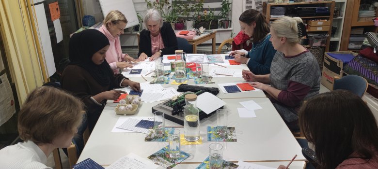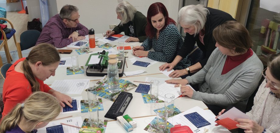 Zu Beginn des Kurses führte Traute Salzmann die Teilnehmenden ins Thema ein und las aus einer Braillezeitschrift mit den Fingern einen kleinen Text vor. Dann wurde das Brailleschriftsystem erläutert: Die Schwarzschriftbraille wird dabei mit den Augen gelesen, während die Punktschriftbraille sowohl mit den Augen als auch mit den Fingern gelesen werden kann. Dann durften die Teilnehmenden mit Hilfe des Braille-Alphabetes, auf einem Übungsblatt mit vorgedruckten Feldern für die Punkte, mit Bleistift die ersten Buchstaben schreiben. Zum Lesen und Austüfteln, was es heißt, gab es einen Text in Schwarzschriftbraille.