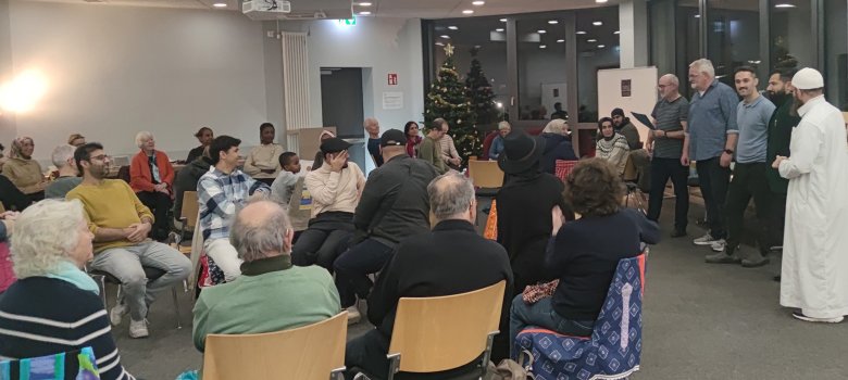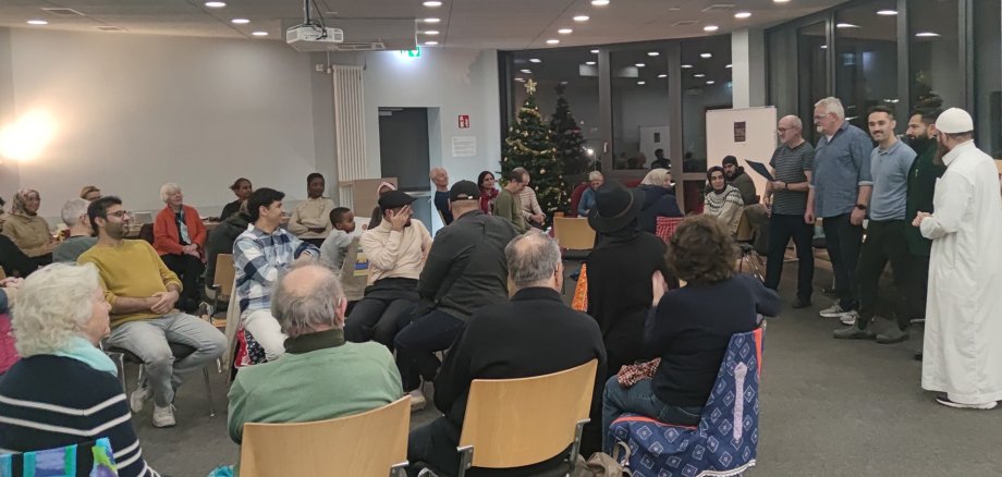 Sitzkreise erwarteten die Gäste, bunt und heimelig war die Atmosphäre. Von Beginn an herrschte freudige Stimmung. Menschen, von 7 bis 91 Jahren alt, kamen am 26. November 2025 zum vierten interreligiösen Dialog im Bürgerhaus zusammen. Die Kooperationspartner Stadtteilbüro Soziale Stadt Steinbach, St. Bonifatiusgemeinde, St. Georgsgemeinde, IFIS e.V., Ahmadyyia Jamat und Rumi Kulturzentrum Frankfurt hatten eingeladen.